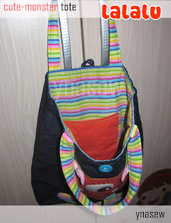 Lagi jatuh hati sma 'monster', jadi bikin aplikasi monster di kain jeans trus dibuat tas tote. Biar kesan monster-nya unyu, saya buat pake bandana, bunga sampai pita :)